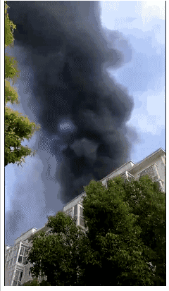 朋友圈转发的火灾现场视频也可以看到,火灾发生时,黑色的浓烟滚滚上升,大约有几十米高,可以想见车棚内的情况的确很麻烦。