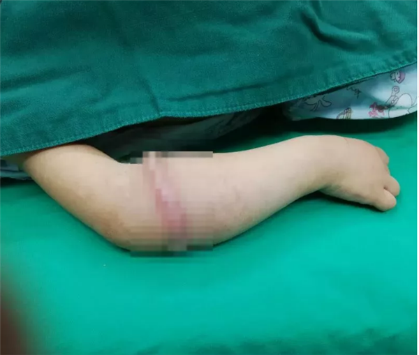4岁的乐乐长期跟着爷爷奶奶生活,不知从什么时候开始,右侧手臂莫名其妙长了一圈“圆环”。最初家里人没有在意这个“圆环”,哪知道乐乐的右前臂一天比一天更红肿。2018年过年后,乐乐手臂严重肿胀,疼痛,而且手指活动受限。看到孩子右前臂比左前臂足足肿大了一圈,这时乐乐的家人才担心起来。