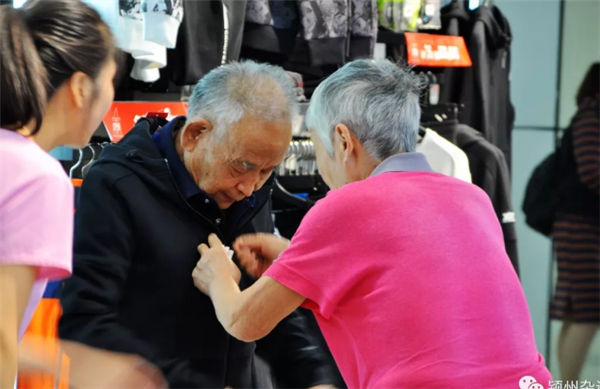 在营业员的帮助下,老人们终于挑选好了一身运动服,穿在老头子身上,看似比较合适,但老伴似乎还有点不太放心,她一边帮老头子拉上拉链,一边问道,褂子衣服合身吗。