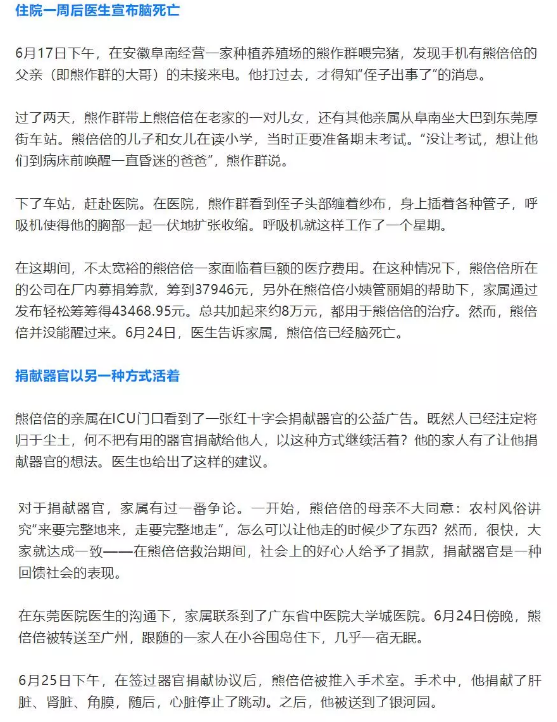 交通事故致颅脑重伤 熊倍倍是安徽阜南人。初中辍学后,他跟着父亲在东莞鞋厂打工。那个时候,老乡带老乡,从安徽阜南来东莞打工的不少。熊倍倍的兄弟姐妹基本大都在东莞的鞋厂扎了根。 去年1